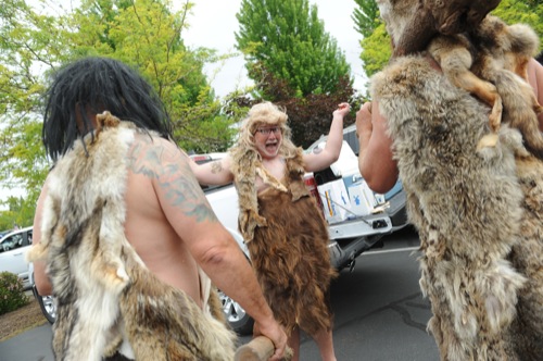 BEA AHBECK / Daily Courier Cavemen gather before the Boatnik parade in Grants Pass Sat, May 28, 2022.