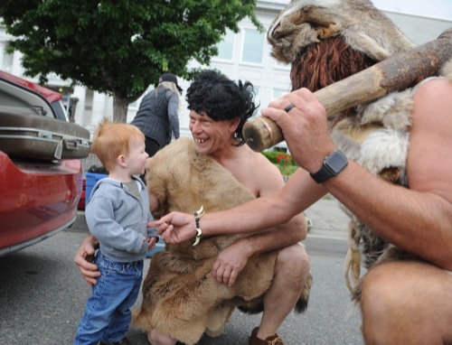 BEA AHBECK / Daily Courier Destry Doane hangs out with his grandfather, caveman Mark Doane during the Boatnik parade in Grants Pass Sat, May 28, 2022.