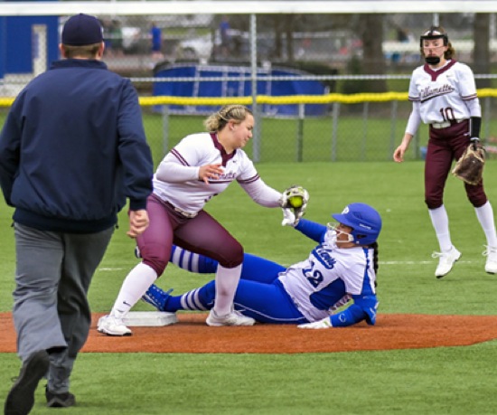(1st inning) GP #12 squeaks out a double by beating the tag to 2nd base.