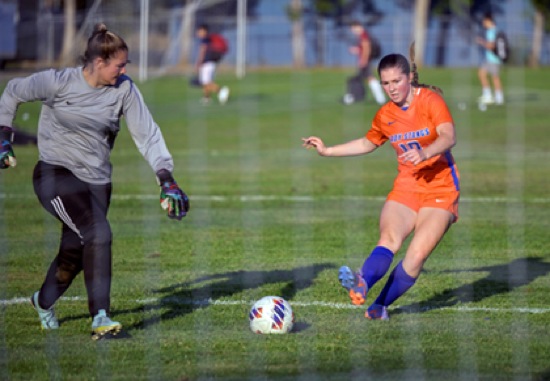SUTH goalie #00 can't get to HV #10 in time as HV #10's kick goes in for a goal