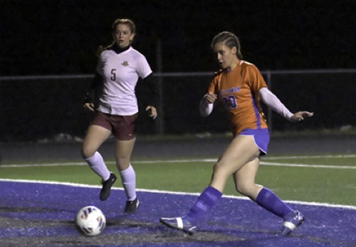 HV # 20 kicks HV's only goal of the night.