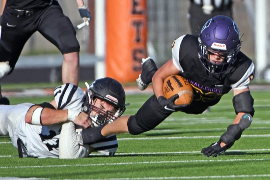 Cascade Christian senior wide receiver Luke Wilson is brought down by Vale's Brooks Haueter during their Class 3A quarterfinal playoff game at Crater High on Saturday.