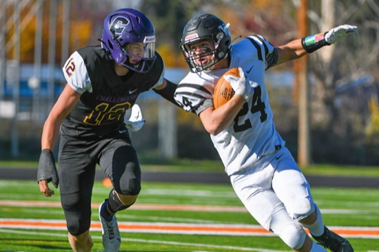 Vale's Landon Haberman (24) looks for running room as Cascade Christian sophomore linebacker Deryk Farmer closes in for a tackle during the first half of their Class 3A quarterfinal playoff game at Crater High on Saturday.