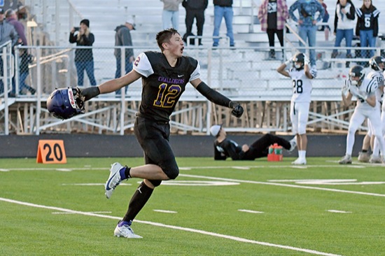 Cascade Christian sophomore linebacker Deryk Farmer (12) celebrates after the Challenger defense stopped Vale's two-point conversion attempt in overtime during their Class 3A quarterfinal playoff game at Crater High on Saturday. The Challengers (11-0) defeated the Vikings 27-26 and will face Dayton (11-0) in the semifinals at 1 p.m. on Saturday, Nov. 18, at Cottage Grove High School.