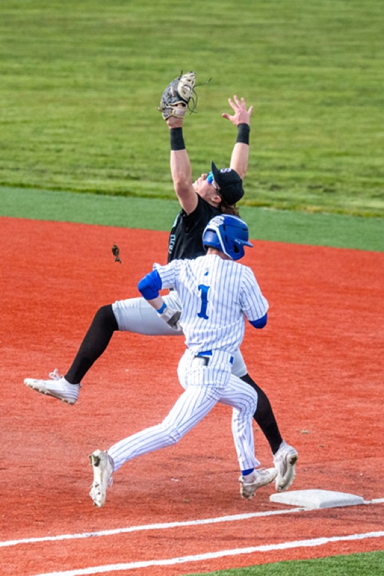 Grants Pass’ Reese Reynolds (1) reaches first base safely as an errant throw to South Salem’s Brady Greer pulls him off the bag. The Saxons rallied with four runs in the fifth inning to defeat the Cavemen 6-5.