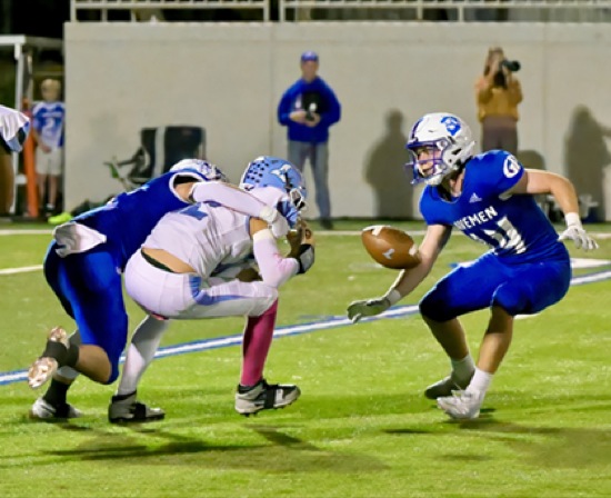 GP #1 gets to LIB QB #12 causing a fumble as GP#14 moves in (GP recovers fumble)