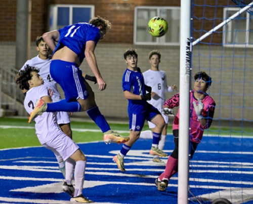 GP #11 pops a header for GP's second goal (L to R) WLM #3, WLM #4, GP #11, GP #8, WLM #6, WLM goalie #1