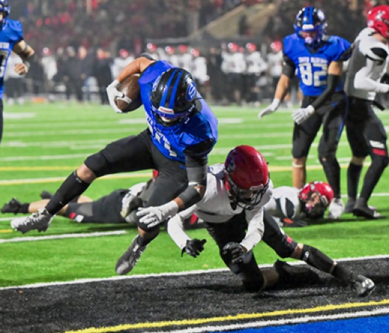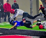 Scenes from Saturday's Class 6A title game between North Medford and South Medford at Spiegelberg Stadium. (L to R) SM #34 dives over NM #27 for SM's first TD