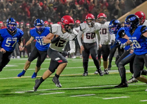 Scenes from Saturday's Class 6A title game between North Medford and South Medford at Spiegelberg Stadium. NM #12 bolts straight ahead and goes on in for a NM TD