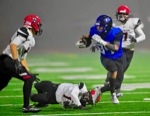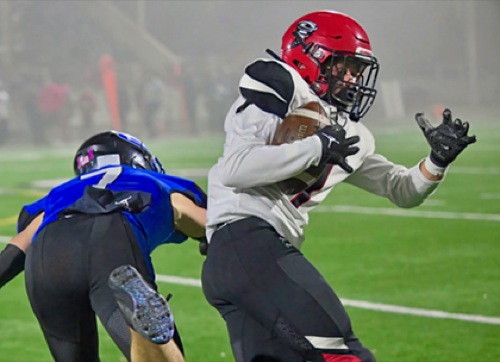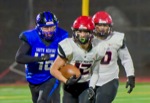 Scenes from Saturday's Class 6A title game between North Medford and South Medford at Spiegelberg Stadium. NM #1 intercepts this SM pass intended for SM receiver #7. (Significant turnover as a few plays later NM would score again)