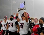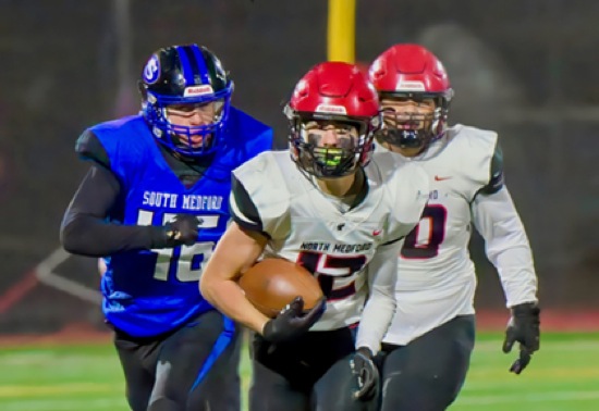 Scenes from Saturday's Class 6A title game between North Medford and South Medford at Spiegelberg Stadium. (L to R) SM #46, NM #12, NM #50