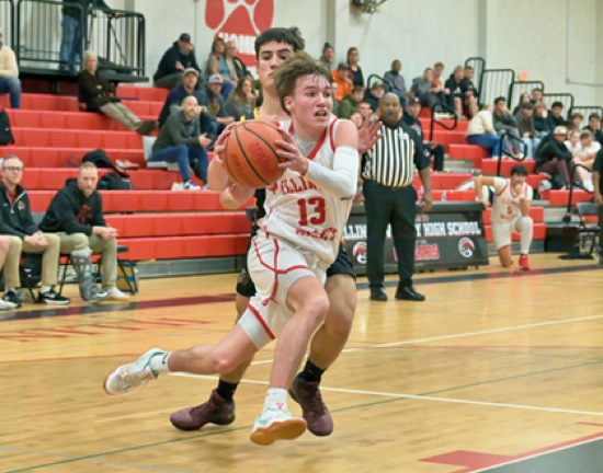 IV #13 drives to the basket past NV #2