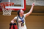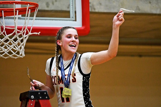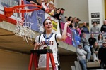 Crater guard Sage Winslow shows her piece of the net to her teammates as the Comets and their coach took turns snipping the twine to celebrate their state championship victory.