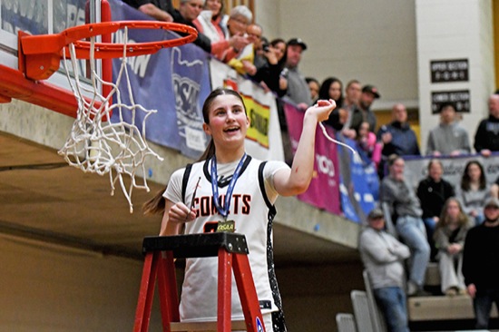 SCOTT STODDARD / Daily Courier Crater guard Taylor Young shows the Crater student section of the crowd her piece of the net.