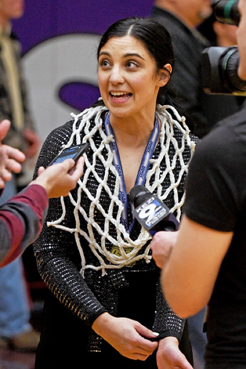 SCOTT STODDARD / Daily Courier Crater coach Amber Lease, wearing the net after the Comets cut it down, is interviewed after the victory.