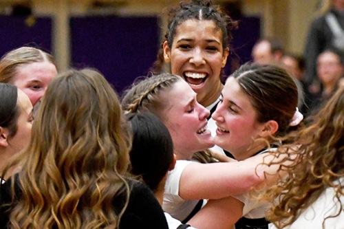 SCOTT STODDARD / Daily Courier Crater's Sage Winslow and Taylor Young embrace as Lydia Traore smiles in the background as the Comets celebrate their victory over South Albany.