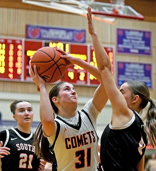 SCOTT STODDARD / Daily Courier Crater guard Taylor Young drives between South Albany's Taylor Donaldson (21) and Maddie Angel.