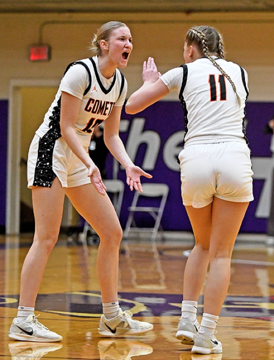 Crater's Alexa Gugliotta (left) fires up teammate Sage Winslow after the Comets jumped out to a 4-0 lead in the first quarter and South Albany called a timeout.