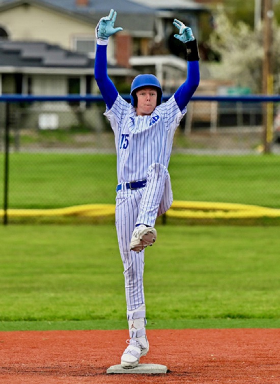 (3rd inning) GP #15 looks back at his teammates and celebrates his double hit.