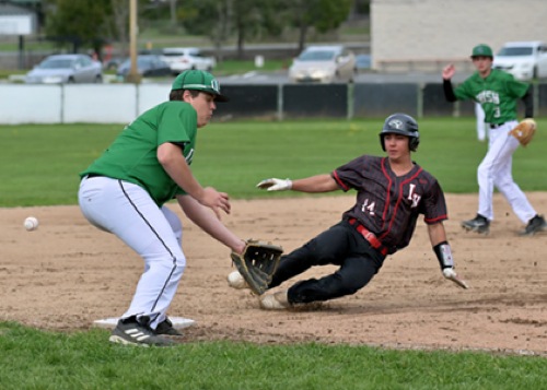 (1st inning) IV #14 slides into 3rd base but the ball gets by Riddle 3rd baseman #20. IV #14 then goes onto home to score.