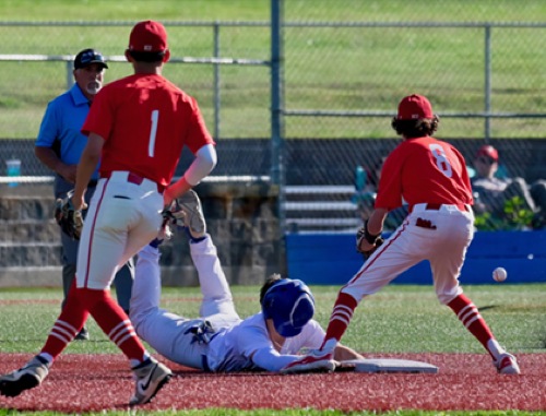 (1st inning) Even with his helmet over his face, HV #4 beats the throw to steal 2nd base.