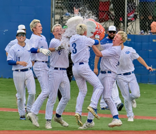 GP celebrates the come from behind 7th inning win. (L to R) GP #11, GP #5, GP #6, GP #3, GP #15 (throwing water) , GP # 9