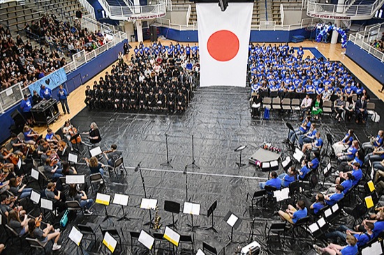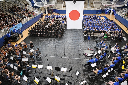 The flag of Japan hangs from a raised basketball goal inside Heater-Newman Memorial Gymnasium during a welcome ceremony honoring the Keisei High School band at Grants Pass High School.