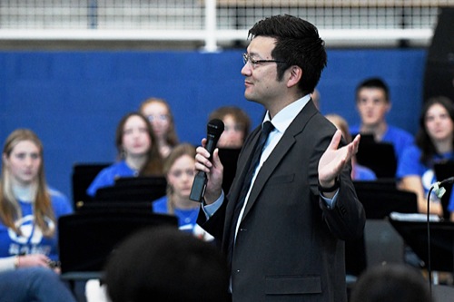 SCOTT STODDARD / Daily Courier Keisei High School band director Tomohide Kodama speaks to the assembly during the welcome ceremony.