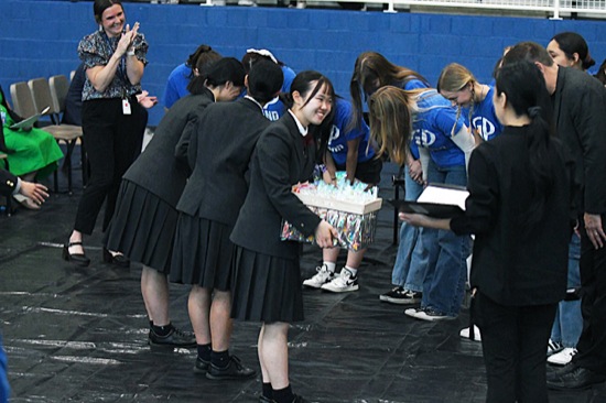 SCOTT STODDARD / Daily Courier Akane Honda of the Keisei High School band smiles after receiving a basket full of friendship bracelets made by Grants Pass students.