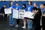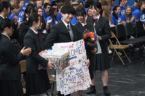 SCOTT STODDARD / Daily Courier Manato Yoshimoto holds signs presented to the Keisei band students.