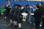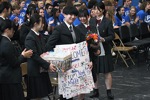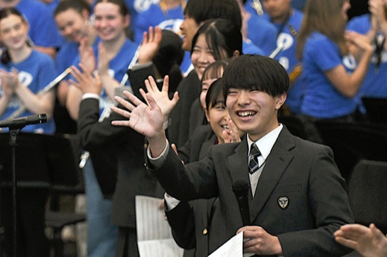 Manato Yoshimoto waves after taking part in a presentation where Keisei High School band members explained to the welcome ceremony crowd, in English, about the nation of Japan, the city of Kumamoto, and Keisei High.
