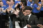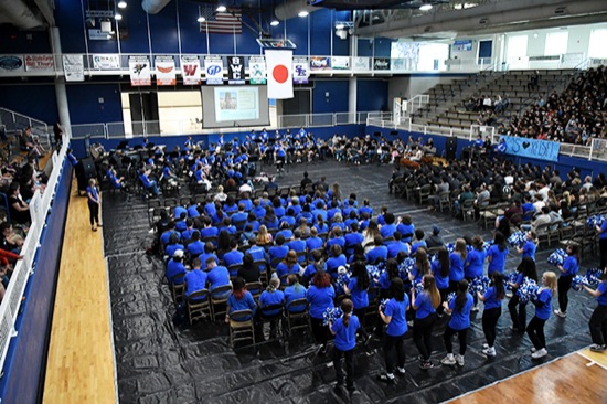 The flag of Japan hangs from a raised basketball goal inside Heater-Newman Memorial Gymnasium during a welcome ceremony honoring the Keisei High School band at Grants Pass High School.