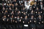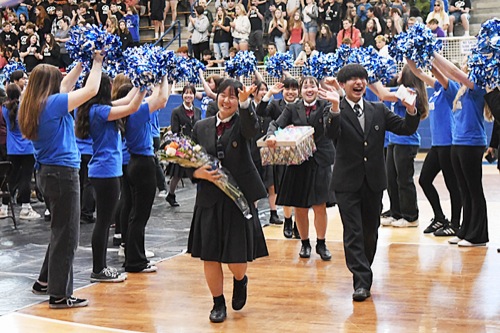 Haruhi Morita (holding flowers) and Manato Yoshimoto wave as they exit a welcome ceremony for the Keisei High School band at Grants Pass High School’s Heater-Newman Memorial Gymnasium on May 19.
