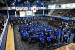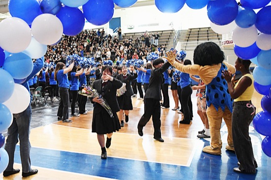 Haruhi Morita (holding flowers) waves as Manato Yoshimoto high-fives the Grants Pass Caveman mascot at the conclusion of a welcome ceremony for the Keisei High School band at Grants Pass High School’s Heater-Newman Memorial Gymnasium on May 19.