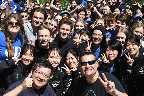 Keisei and Grants Pass band members and Keisei director Tomohide Kodama (front left) and Grants Pass director Lewis Norfleet (front right) pose for a photo after disembarking Hellgate jetboats on May 19.