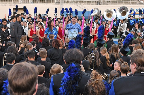 Grants Pass band director Lewis Norfleet speaks to the musicians from both countries following the Boatnik Preview Concert at Mel Ingram Field featuring the Keisei High School marching band from Kumamoto, Japan, and Grants Pass High and middle school marching bands.