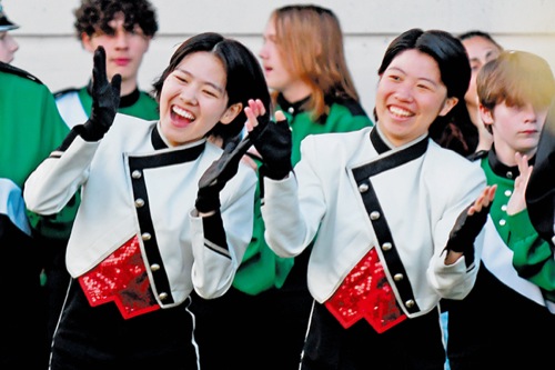 Keisei High band members Meisa Sakurai (left) and Rinoa Kato clap along to the Grants Pass High fight song as it is performed by the GPHS marching band.