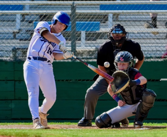 (1st inning) Nuggets #14 drives this pitch over the left fielder's head for a double