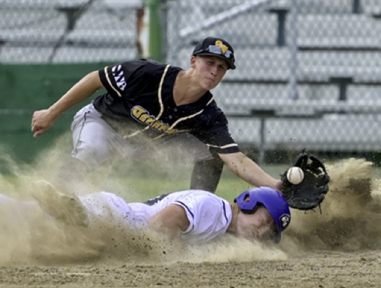 (3rd inning) Nuggets #13 gets his arm to the 3rd base bag before Redmond #1 can make a tag - SAFE!! (gets a triple out of his hit) Redmond wins over the Nuggets, 6-3 (Game #1) Photos By: Joel Takarsh