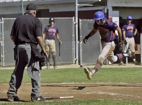 (6th inning) The home plate umpire watches as Mustang's #37 comes in with a flying leap for the Mustang's 11th run