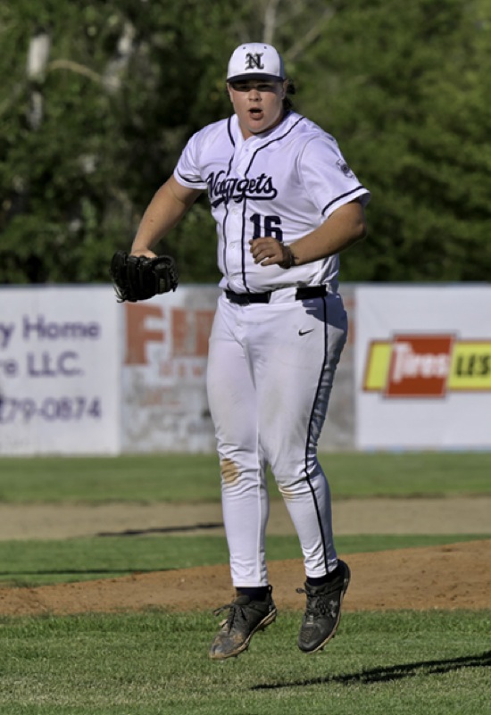 Nuggets pitcher #16 jumps in celebration of his final strikeout and their 2-0 win over Roseburg (GAME #1)