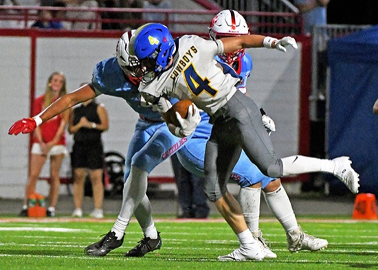 Crook County wide receiver Talen Williams (4) gains yardage after making a catch against Ashland on Friday night, Sept. 12, at Walter A. Phillips Field in Ashland.