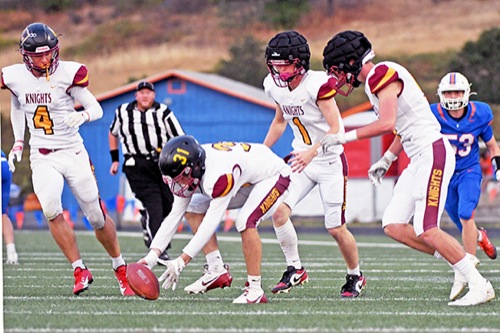 North Valley's Wyatt Bell scoops up the ball after Hidden Valley failed to field a Knight kickoff in the first quarter on Friday night, Sept. 19, in Murphy. Bell's recovery gave North Valley the ball and the Knights went on to score a touchdown on the ensuing drive.