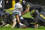Rogue River's Gianni Gervasi (left) looks for space as he embarks on a long touchdown run in the first quarter, Gervasi's second TD of the period, on Friday night at Chieftain Stadium. The Chieftains defeated the Crusaders 65-42.
