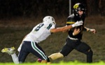 Rogue River defenders swarm St. Mary's quarterback Mason James (5) during the first quarter on Friday night at Chieftain Stadium. The Chieftains defeated the Crusaders 65-42.
