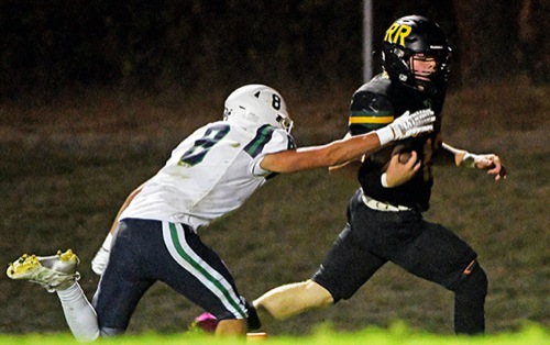 Rogue River's Brennen Rolfe (right) outruns Dom Hiratzka (8) of St. Mary's to the end zone to score Rogue River's third touchdown of the opening quarter on Friday night at Chieftain Stadium. The Chieftains defeated the Crusaders 65-42.