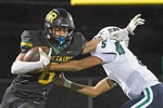 Destyn James (3) of St. Mary's hauls in a reception despite the tight defense of Rogue River's Trevor Dirks (4) and Mason Scott (left) during the first quarter on Friday night at Chieftain Stadium. The Chieftains defeated the Crusaders 65-42.