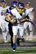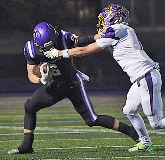Burns defensive back Coltin Miller grabs the facemask of Cascade Christian's Caleb Scaglione during the Class 3A football state championship game at Summit High School in Bend on Saturday night. The Challengers defeated the Hilanders 35-28 to win the state title and complete a perfect 13-0 season.