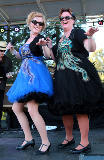 Janeen McGinnis, left and Michele Spohn, get the crowd of over 2,000 going at the Back to the Fifties concert at Riverside Park Tuesday. Over 2,000 peolpe were in attendance to the event that kicked off the Back to the Fifties event occuring this week.