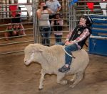 Jameson Smith, 7, holds on tight during another wild ride at the Wool Busters event at the Josephine County Fair Wednesday. Smith got a blue ribbon for his efforts. "We want to caputre kids' interest in the sport of rodeo," organizer Frank Rendon says. "We're looking for the next rodeo champ."